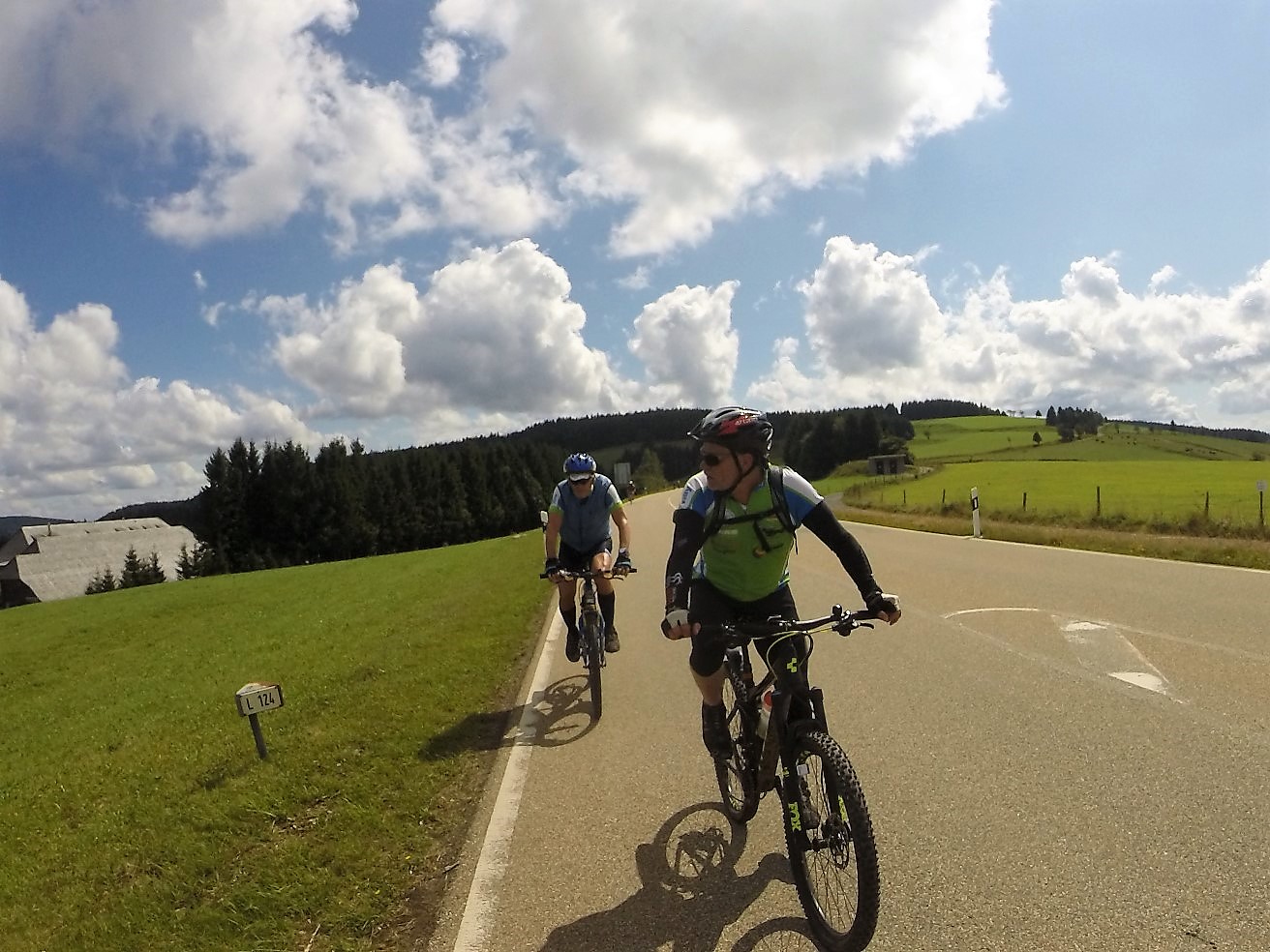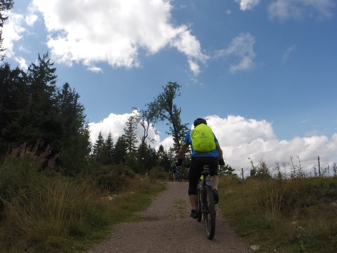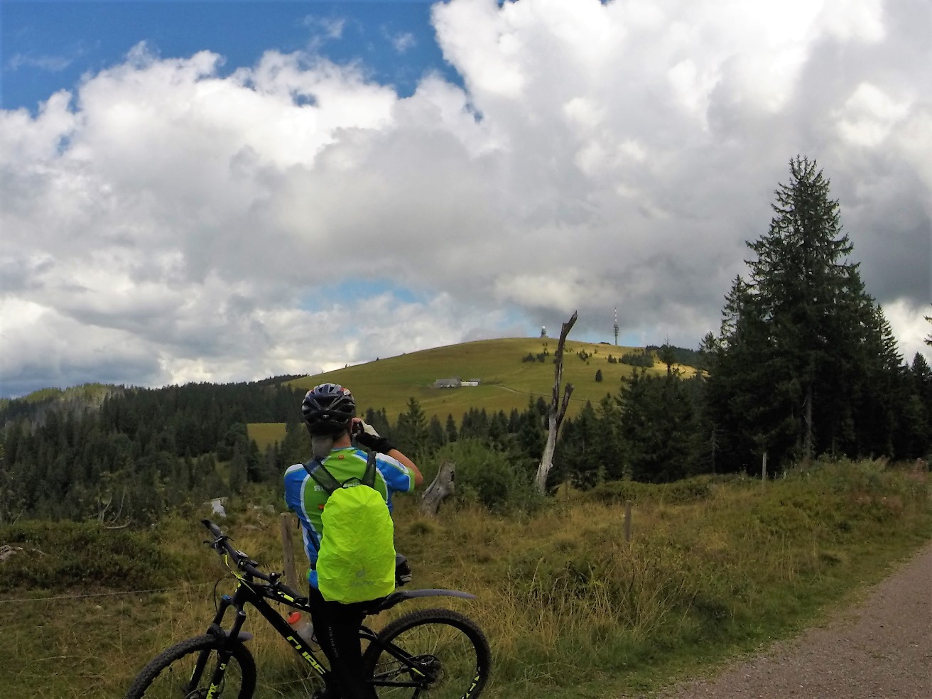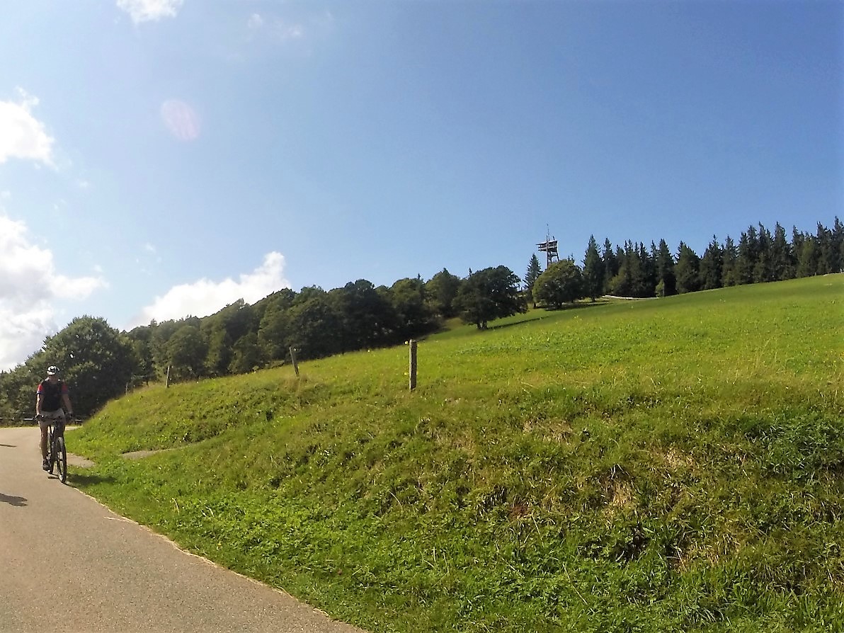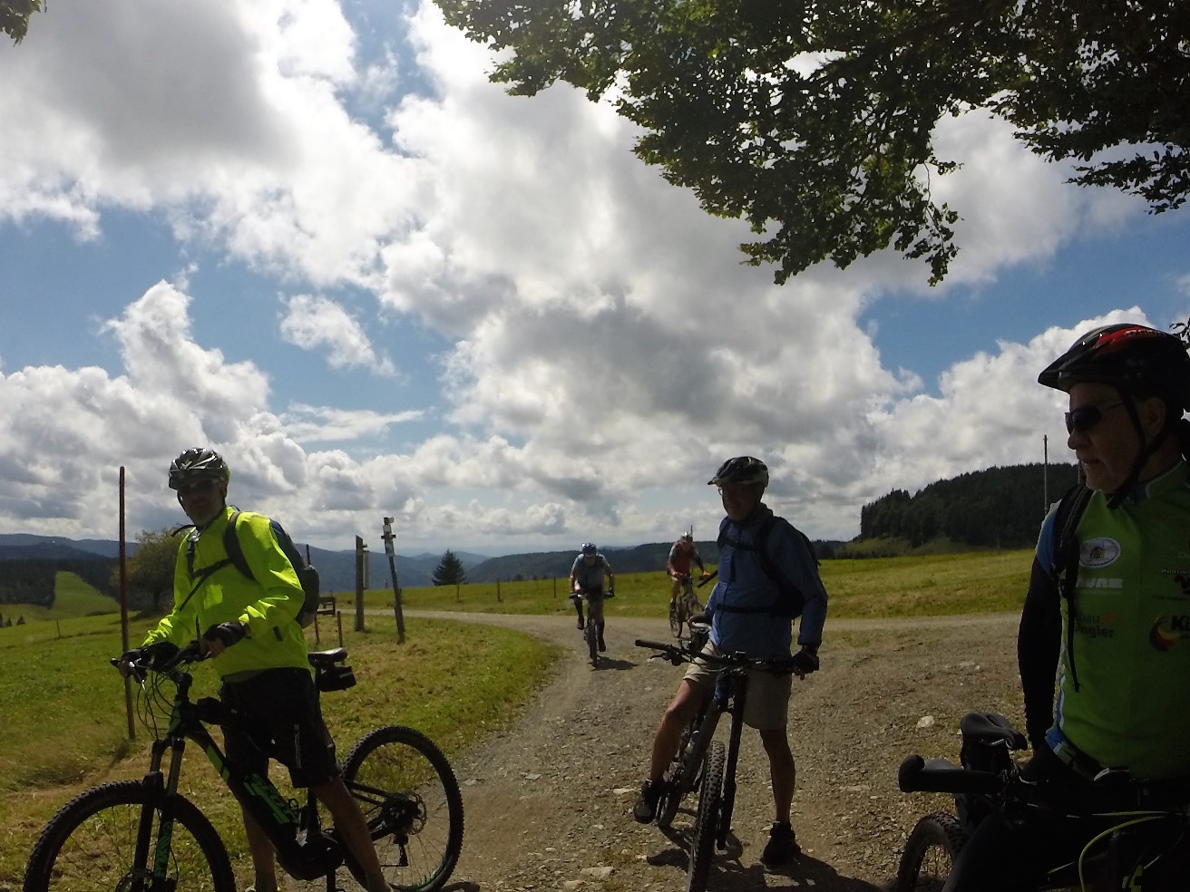 Frisch gestärkt führte uns unser Guide Diethard dann weiter zum Radschert, oberhalb Todtnauberg. Die Route führte führte uns auf 1200 m Höhe rund um den Ort zur Berger Höhe. Bevor dann der nächste 4 km lange Anstieg auf dem Feldbergstäßle in Richtung Todtnauer Hütte folgte. Kurz vor der Hütte mussten wir (ohne Rast) dann links abbiegen. Nach 2 weiteren, kurzen Anstiegen waren wir auf dem höchsten Punkt der Tagestour auf 1390 m Meereshöhe angelangt. Am dortigen Aussichtspunkt genossen wir eine 360° Aussicht. Nach dem wir diese schönen Eindrücke in uns aufgesogen hatten.(so gut das eben geht), folgte noch die Belohnung all der Mühen der letzten Stunden. Denn nun ging es fast nur noch abwärts.