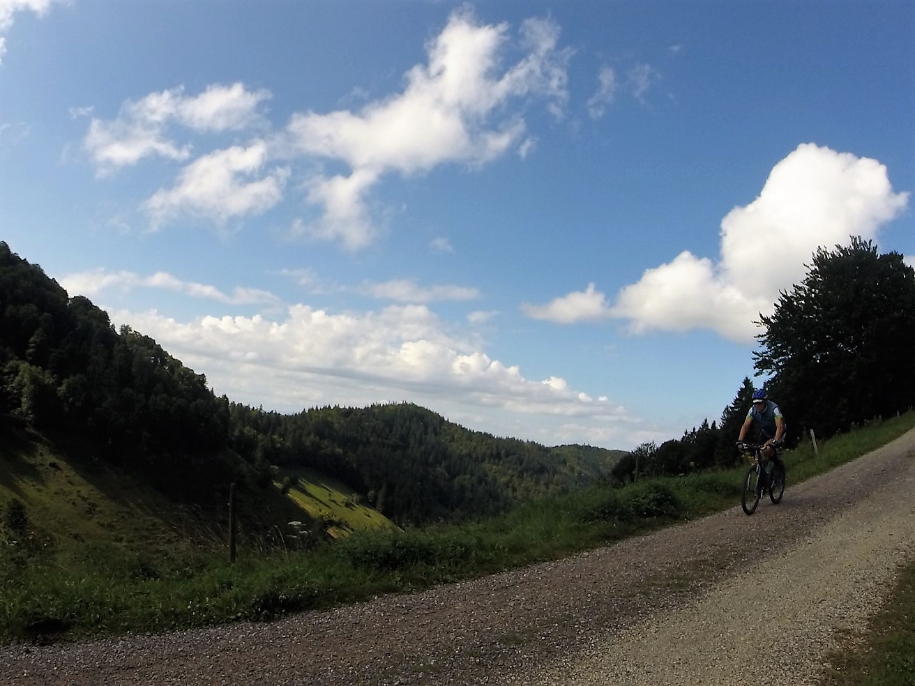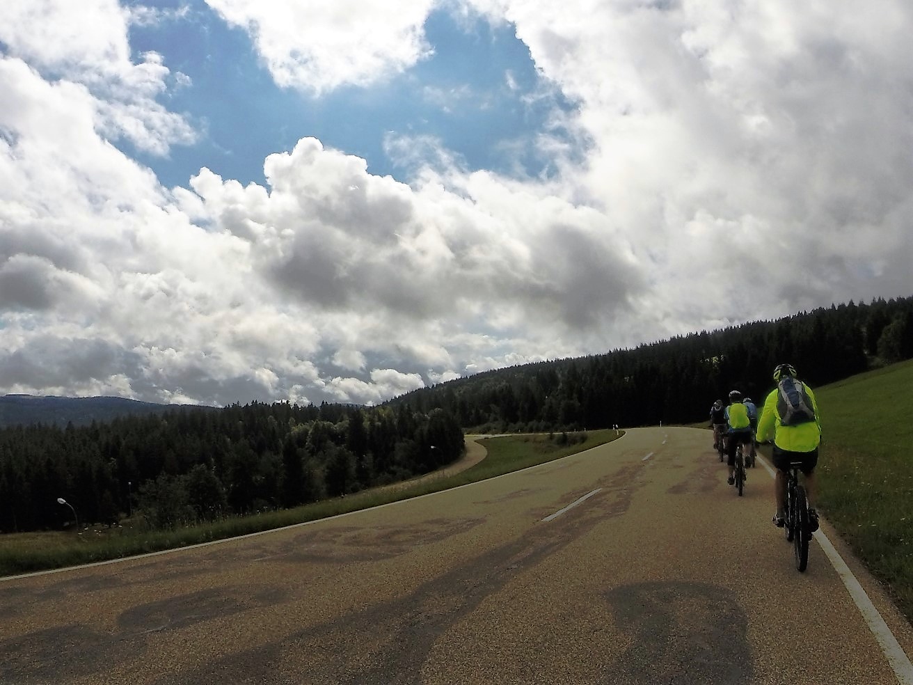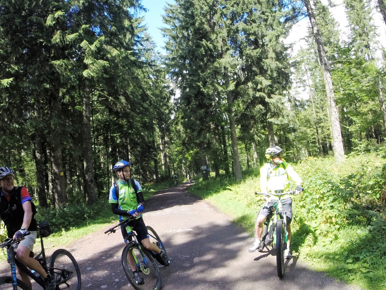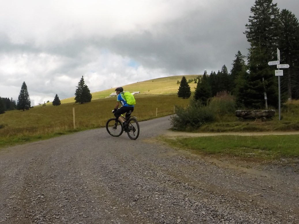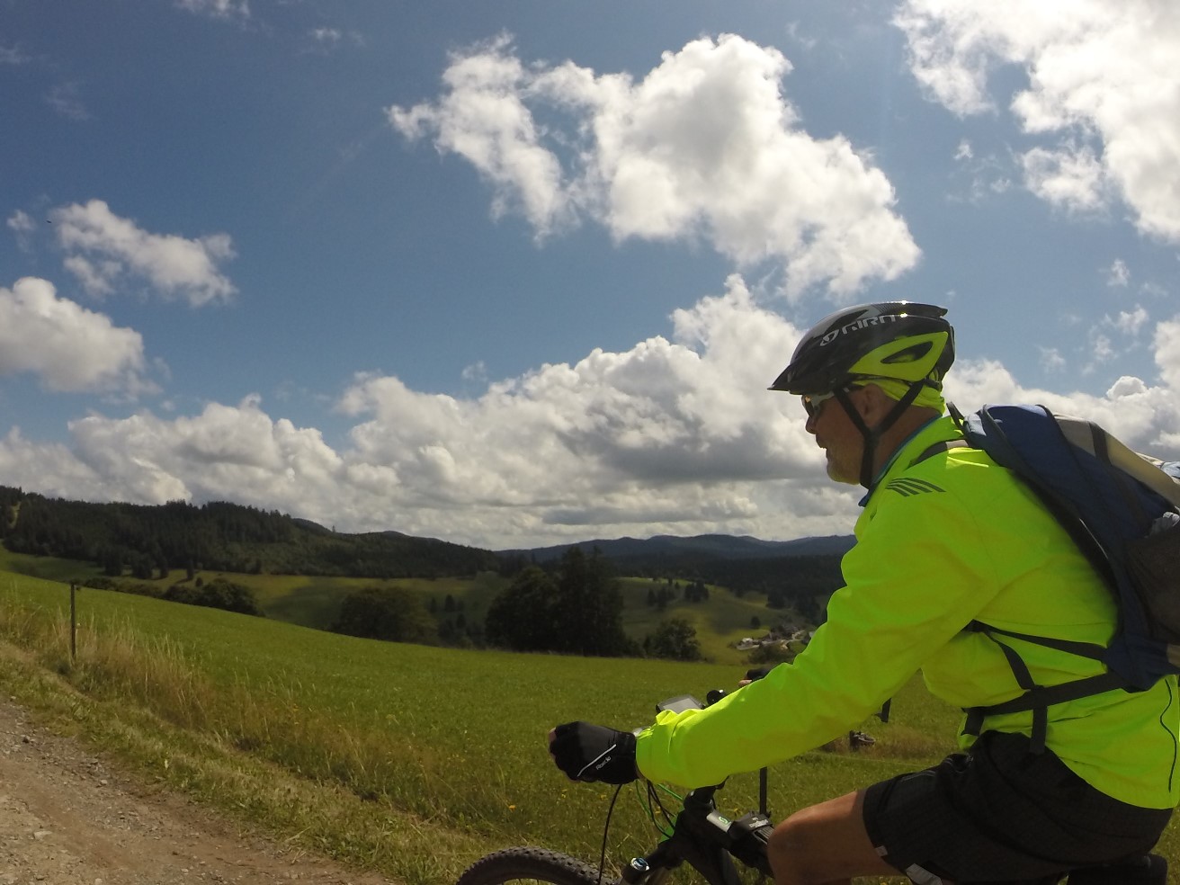 Frisch gestärkt führte uns unser Guide Diethard dann weiter zum Radschert, oberhalb Todtnauberg. Die Route führte führte uns auf 1200 m Höhe rund um den Ort zur Berger Höhe. Bevor dann der nächste 4 km lange Anstieg auf dem Feldbergstäßle in Richtung Todtnauer Hütte folgte. Kurz vor der Hütte mussten wir (ohne Rast) dann links abbiegen. Nach 2 weiteren, kurzen Anstiegen waren wir auf dem höchsten Punkt der Tagestour auf 1390 m Meereshöhe angelangt. Am dortigen Aussichtspunkt genossen wir eine 360° Aussicht. Nach dem wir diese schönen Eindrücke in uns aufgesogen hatten.(so gut das eben geht), folgte noch die Belohnung all der Mühen der letzten Stunden. Denn nun ging es fast nur noch abwärts.
