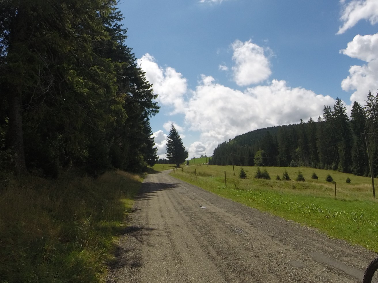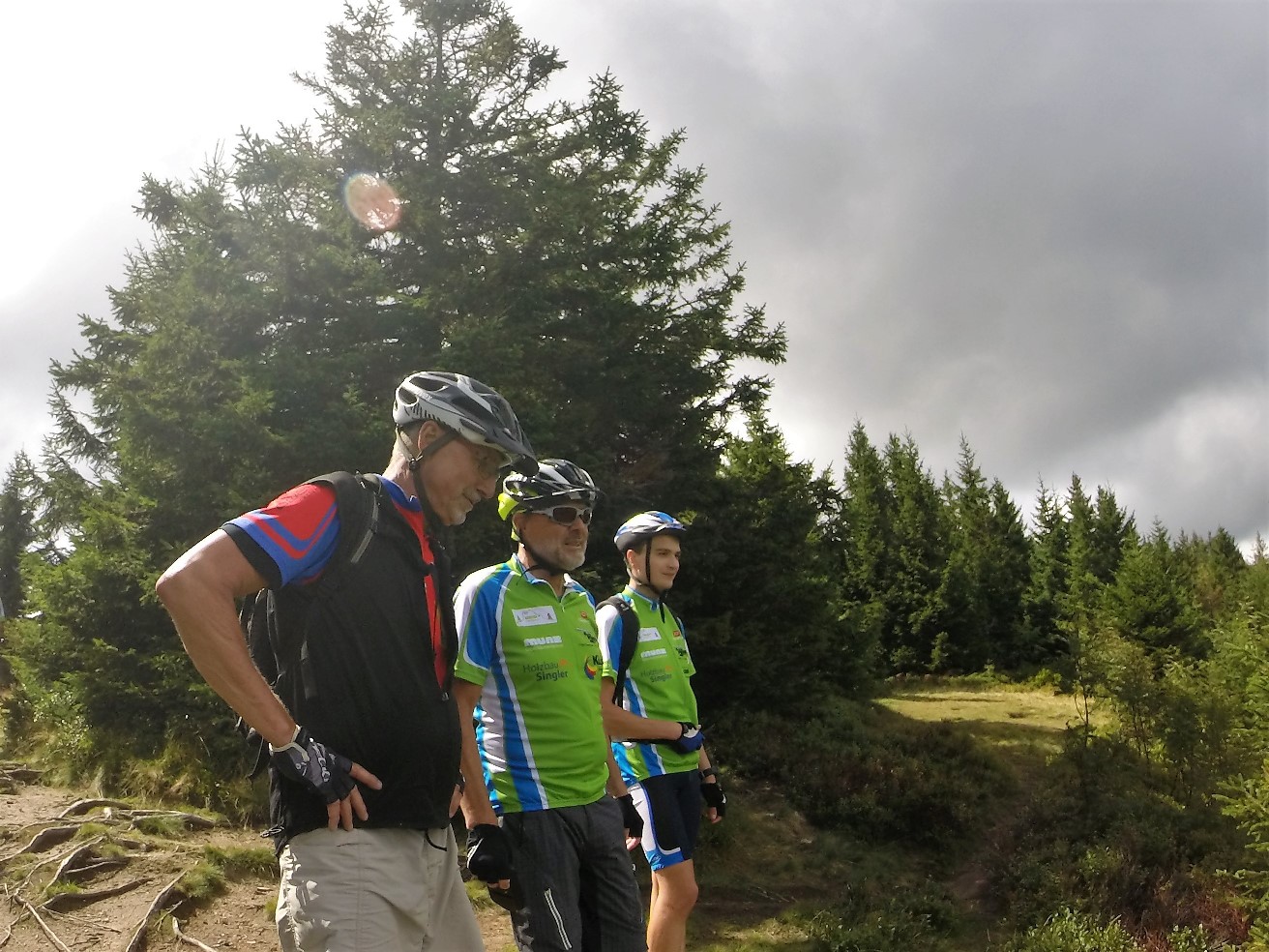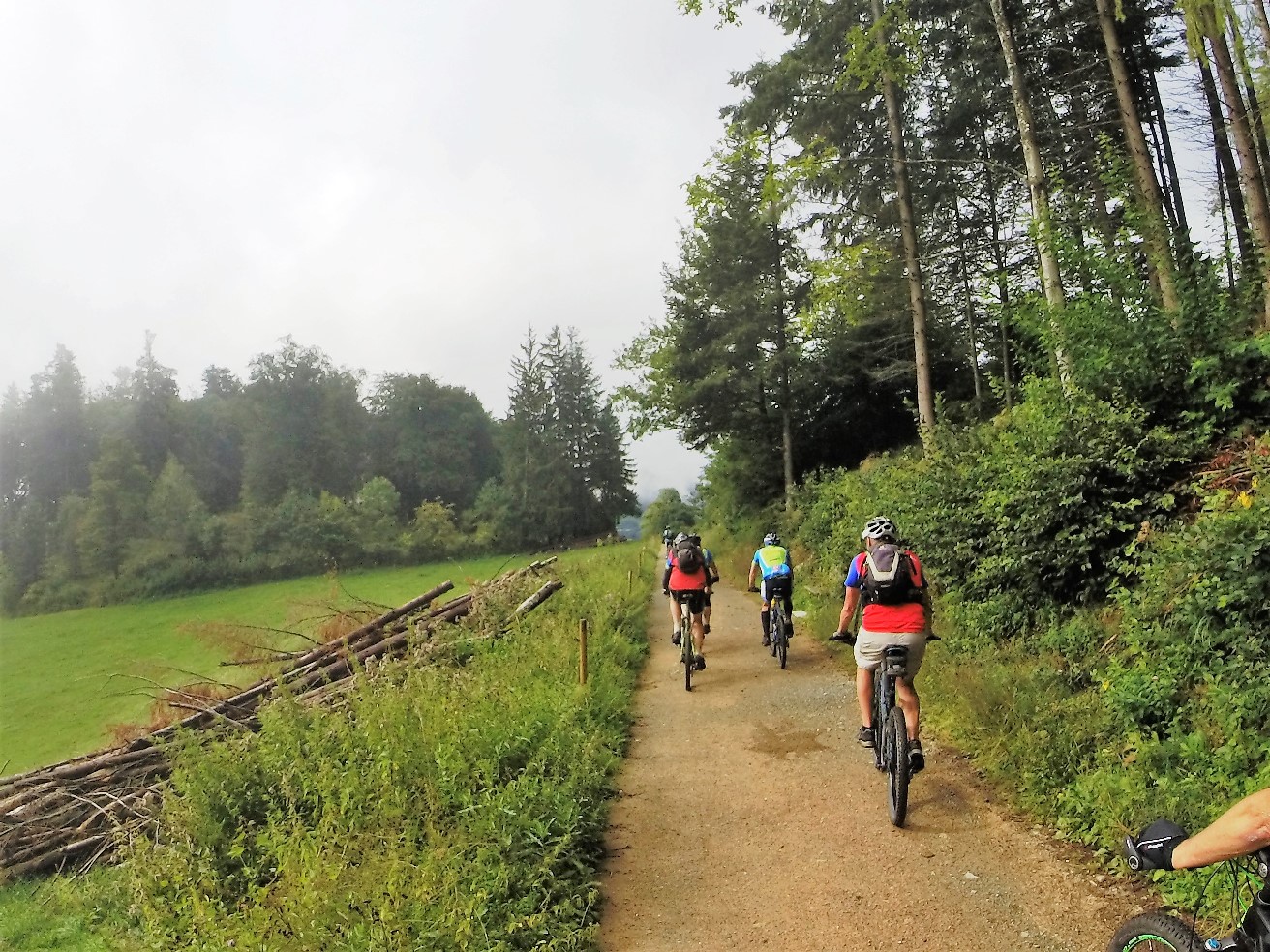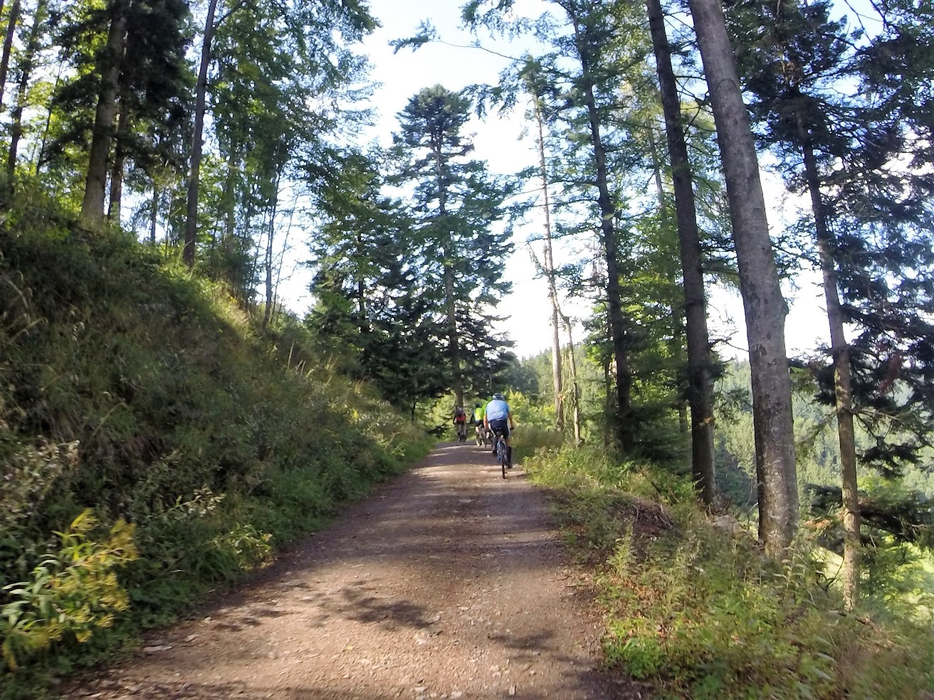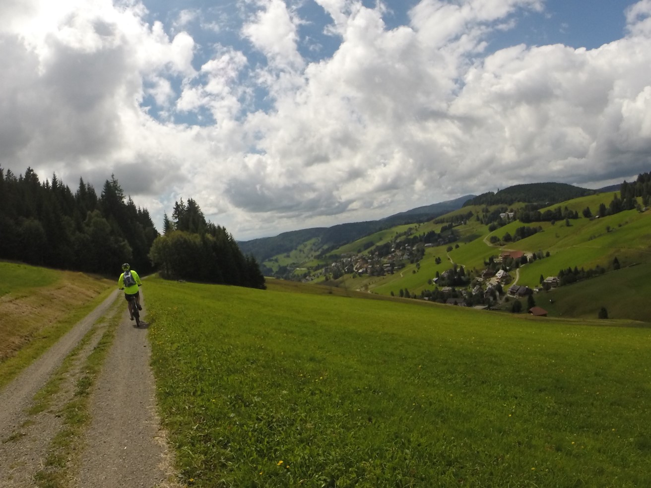 Frisch gestärkt führte uns unser Guide Diethard dann weiter zum Radschert, oberhalb Todtnauberg. Die Route führte führte uns auf 1200 m Höhe rund um den Ort zur Berger Höhe. Bevor dann der nächste 4 km lange Anstieg auf dem Feldbergstäßle in Richtung Todtnauer Hütte folgte. Kurz vor der Hütte mussten wir (ohne Rast) dann links abbiegen. Nach 2 weiteren, kurzen Anstiegen waren wir auf dem höchsten Punkt der Tagestour auf 1390 m Meereshöhe angelangt. Am dortigen Aussichtspunkt genossen wir eine 360° Aussicht. Nach dem wir diese schönen Eindrücke in uns aufgesogen hatten.(so gut das eben geht), folgte noch die Belohnung all der Mühen der letzten Stunden. Denn nun ging es fast nur noch abwärts.