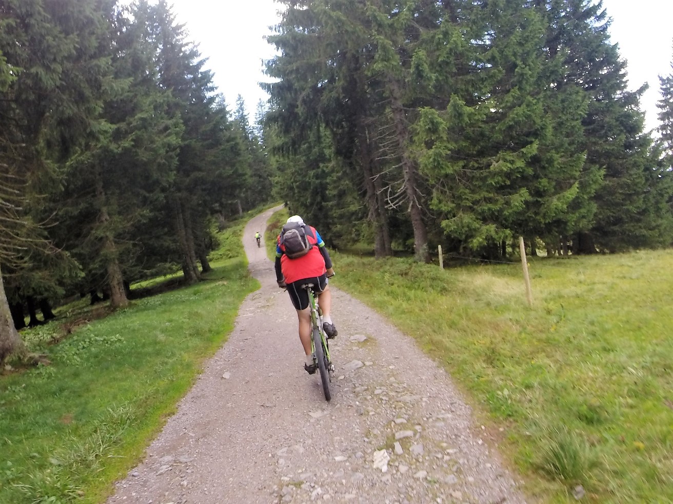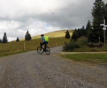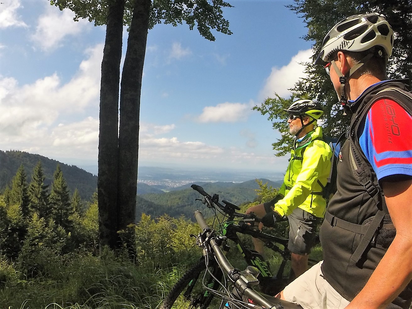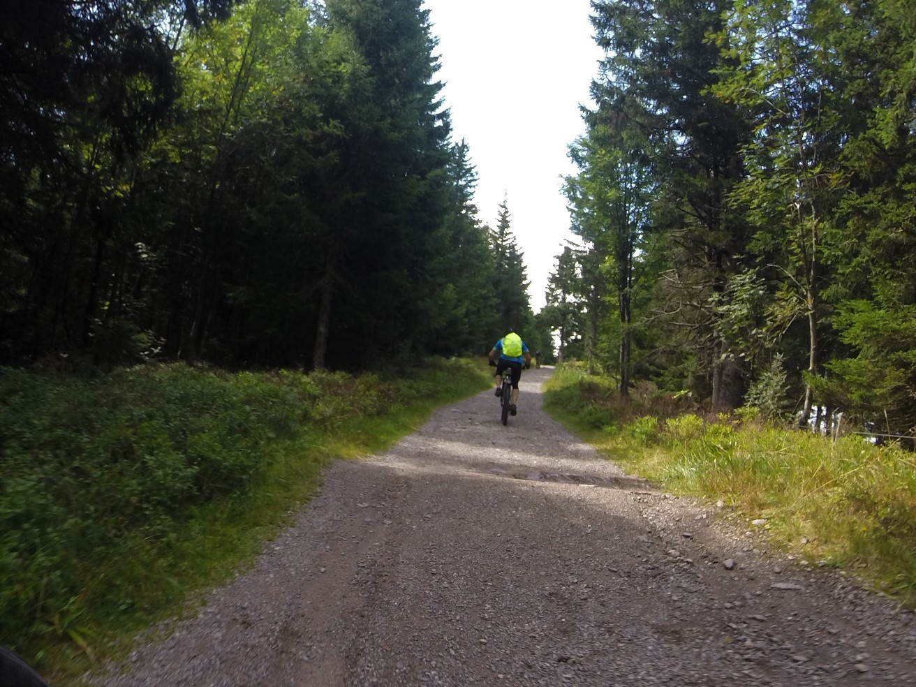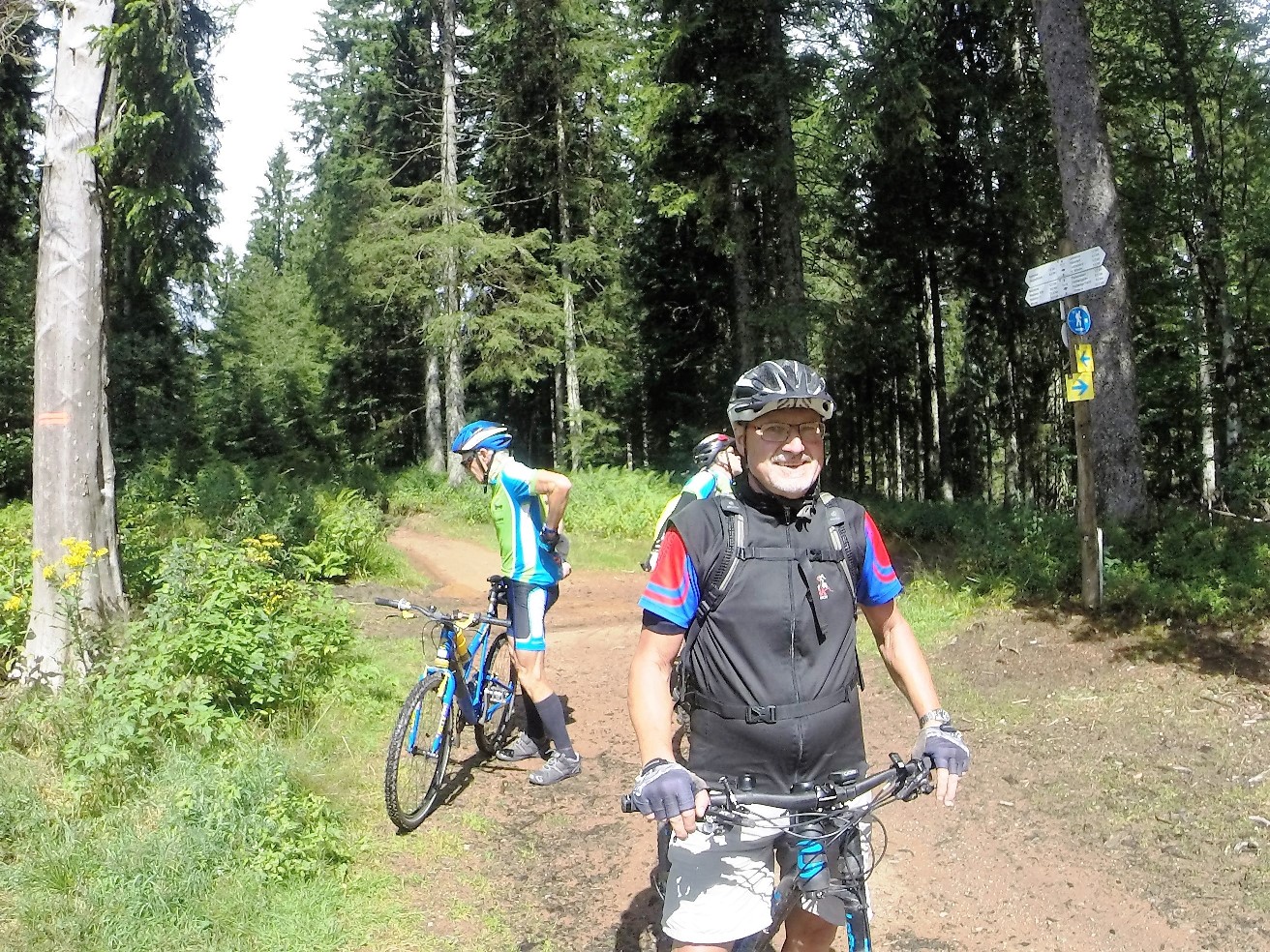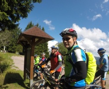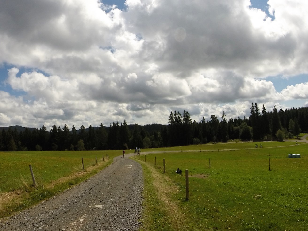 Frisch gestärkt führte uns unser Guide Diethard dann weiter zum Radschert, oberhalb Todtnauberg. Die Route führte führte uns auf 1200 m Höhe rund um den Ort zur Berger Höhe. Bevor dann der nächste 4 km lange Anstieg auf dem Feldbergstäßle in Richtung Todtnauer Hütte folgte. Kurz vor der Hütte mussten wir (ohne Rast) dann links abbiegen. Nach 2 weiteren, kurzen Anstiegen waren wir auf dem höchsten Punkt der Tagestour auf 1390 m Meereshöhe angelangt. Am dortigen Aussichtspunkt genossen wir eine 360° Aussicht. Nach dem wir diese schönen Eindrücke in uns aufgesogen hatten.(so gut das eben geht), folgte noch die Belohnung all der Mühen der letzten Stunden. Denn nun ging es fast nur noch abwärts.