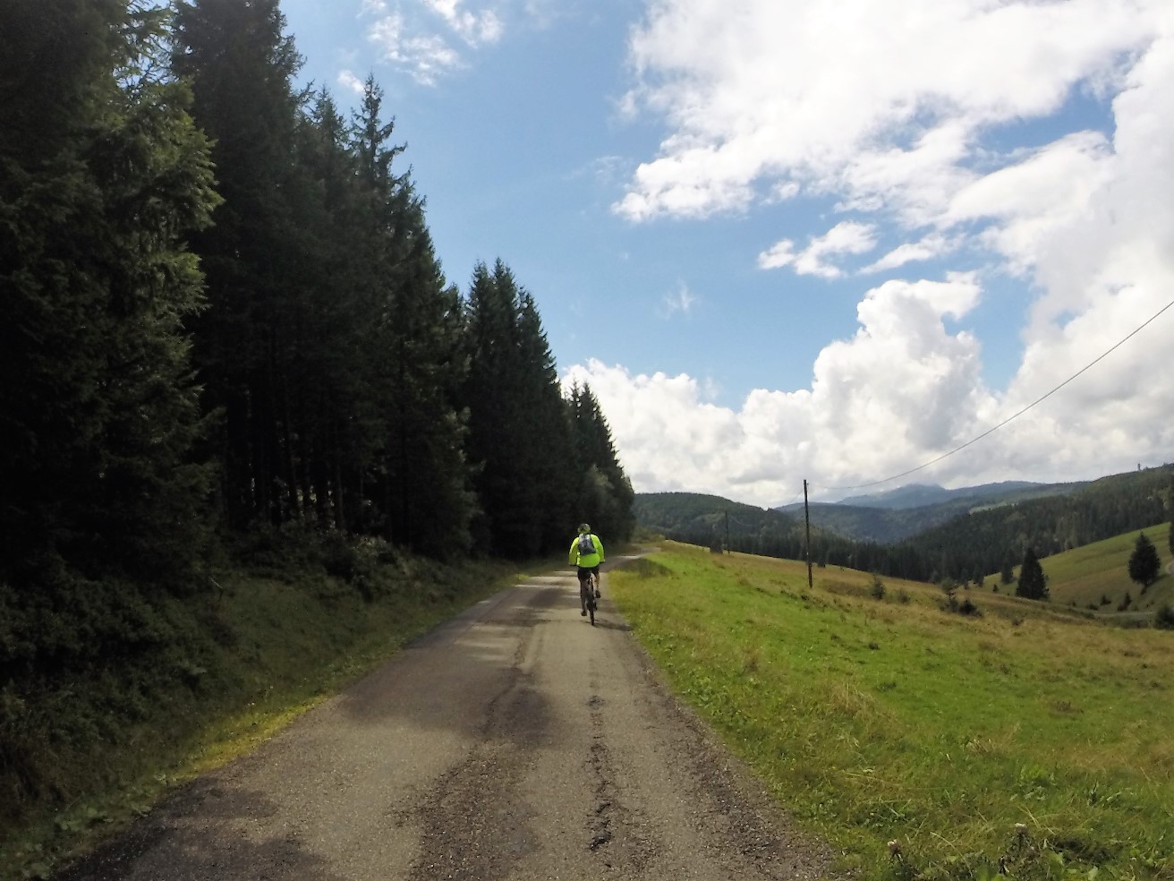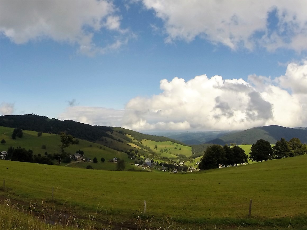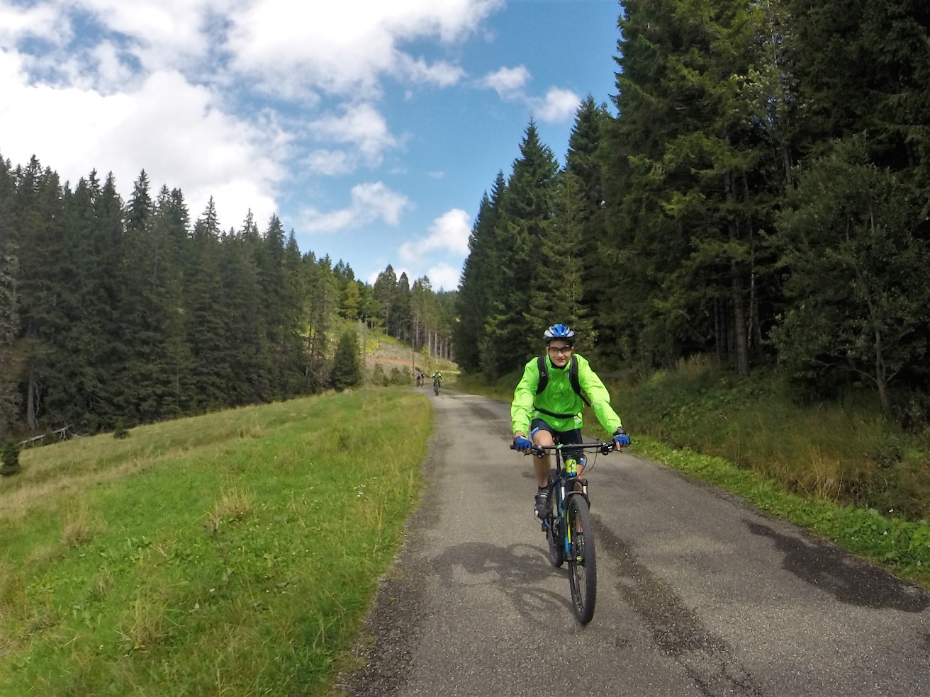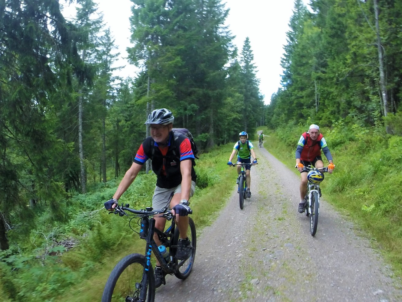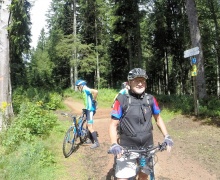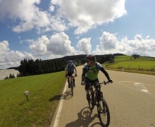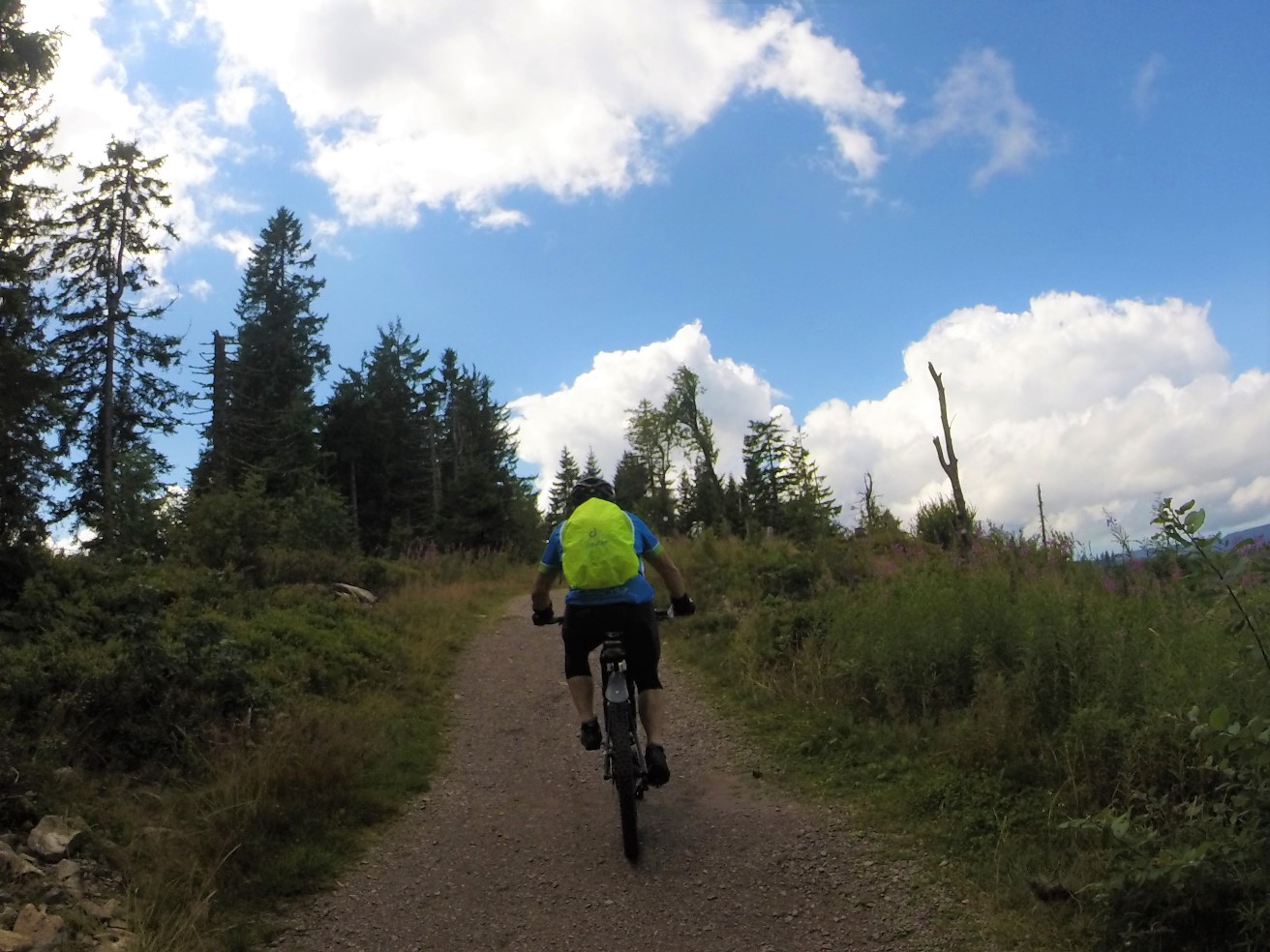 Frisch gestärkt führte uns unser Guide Diethard dann weiter zum Radschert, oberhalb Todtnauberg. Die Route führte führte uns auf 1200 m Höhe rund um den Ort zur Berger Höhe. Bevor dann der nächste 4 km lange Anstieg auf dem Feldbergstäßle in Richtung Todtnauer Hütte folgte. Kurz vor der Hütte mussten wir (ohne Rast) dann links abbiegen. Nach 2 weiteren, kurzen Anstiegen waren wir auf dem höchsten Punkt der Tagestour auf 1390 m Meereshöhe angelangt. Am dortigen Aussichtspunkt genossen wir eine 360° Aussicht. Nach dem wir diese schönen Eindrücke in uns aufgesogen hatten.(so gut das eben geht), folgte noch die Belohnung all der Mühen der letzten Stunden. Denn nun ging es fast nur noch abwärts.