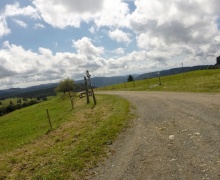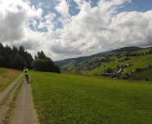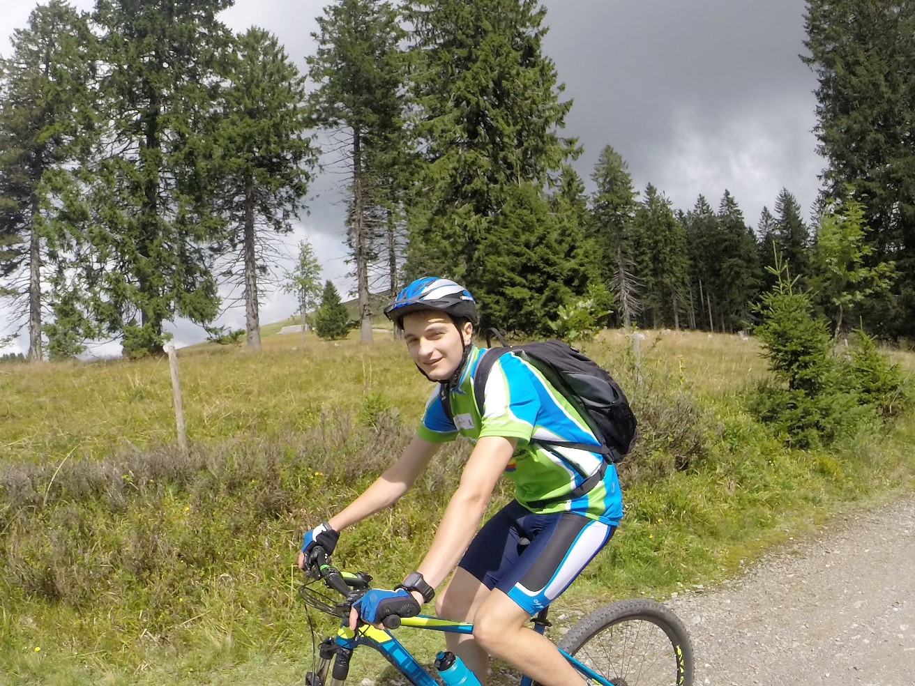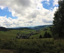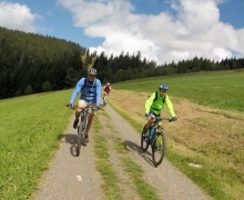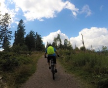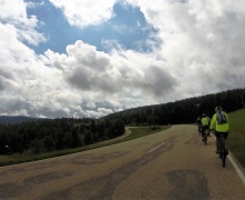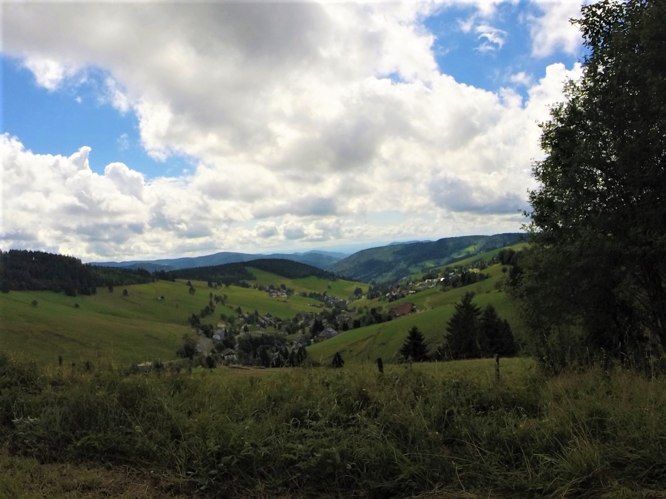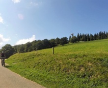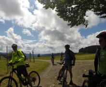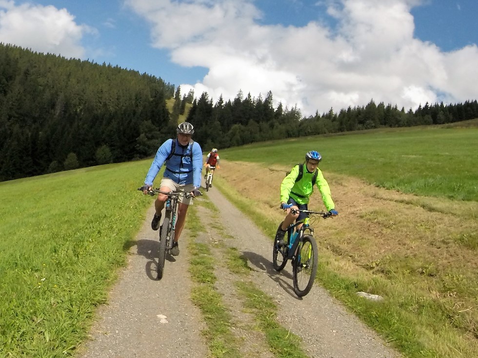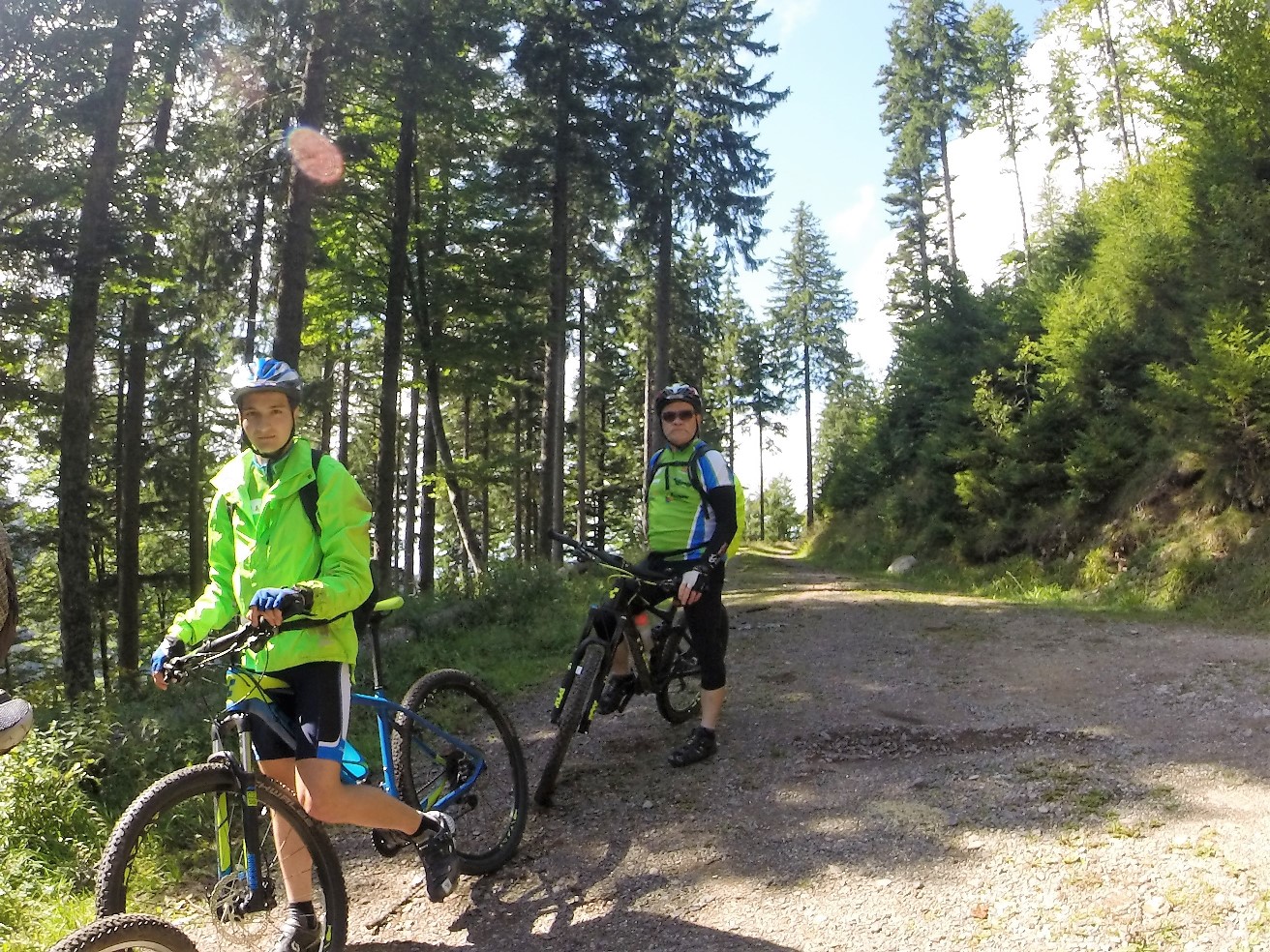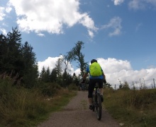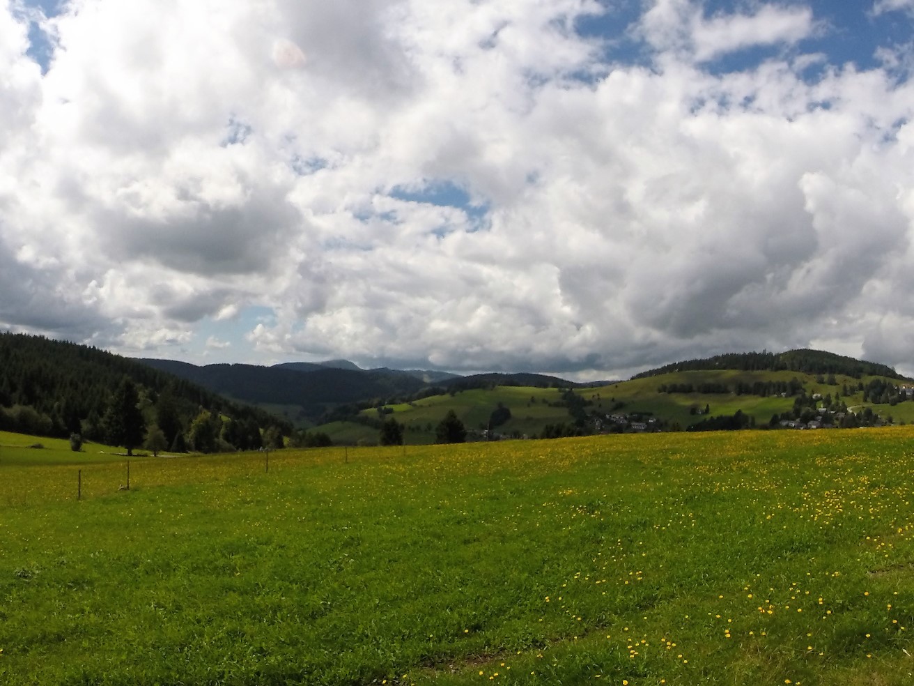 Frisch gestärkt führte uns unser Guide Diethard dann weiter zum Radschert, oberhalb Todtnauberg. Die Route führte führte uns auf 1200 m Höhe rund um den Ort zur Berger Höhe. Bevor dann der nächste 4 km lange Anstieg auf dem Feldbergstäßle in Richtung Todtnauer Hütte folgte. Kurz vor der Hütte mussten wir (ohne Rast) dann links abbiegen. Nach 2 weiteren, kurzen Anstiegen waren wir auf dem höchsten Punkt der Tagestour auf 1390 m Meereshöhe angelangt. Am dortigen Aussichtspunkt genossen wir eine 360° Aussicht. Nach dem wir diese schönen Eindrücke in uns aufgesogen hatten.(so gut das eben geht), folgte noch die Belohnung all der Mühen der letzten Stunden. Denn nun ging es fast nur noch abwärts.