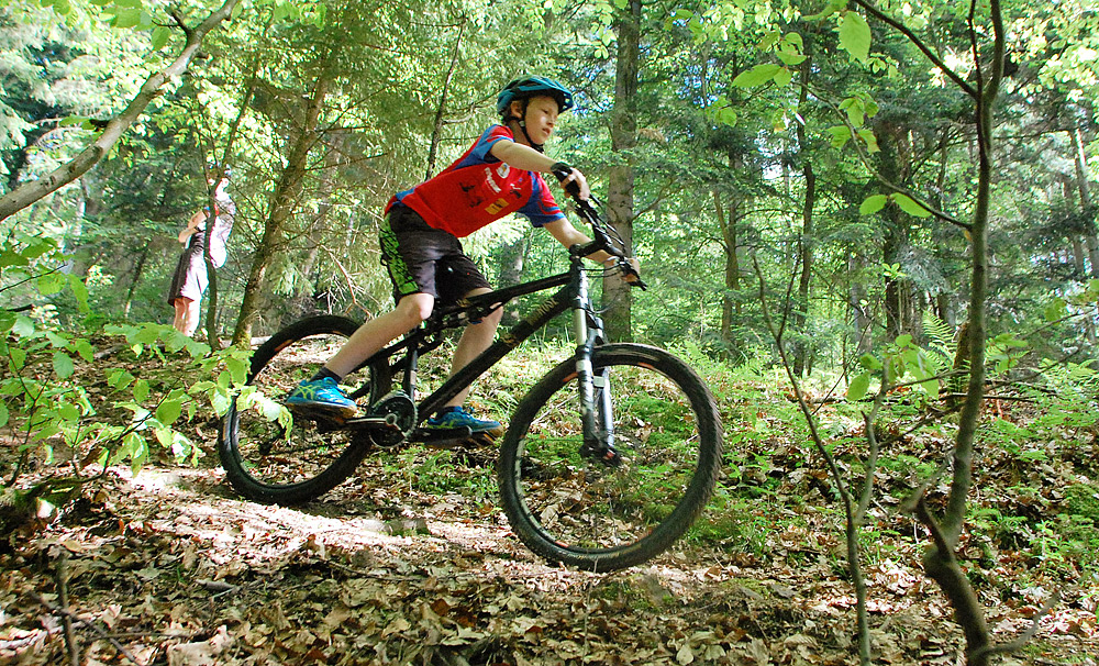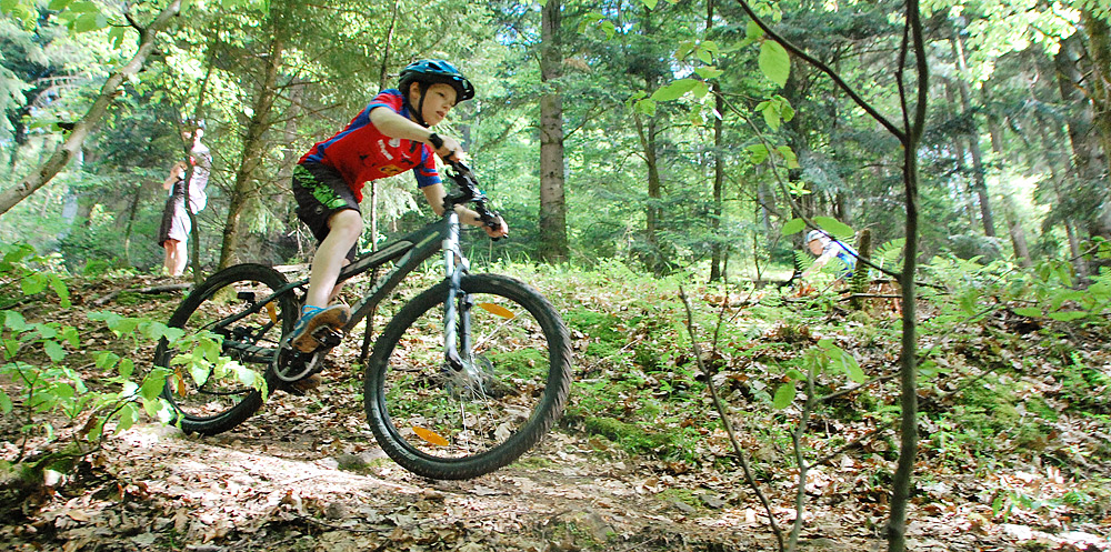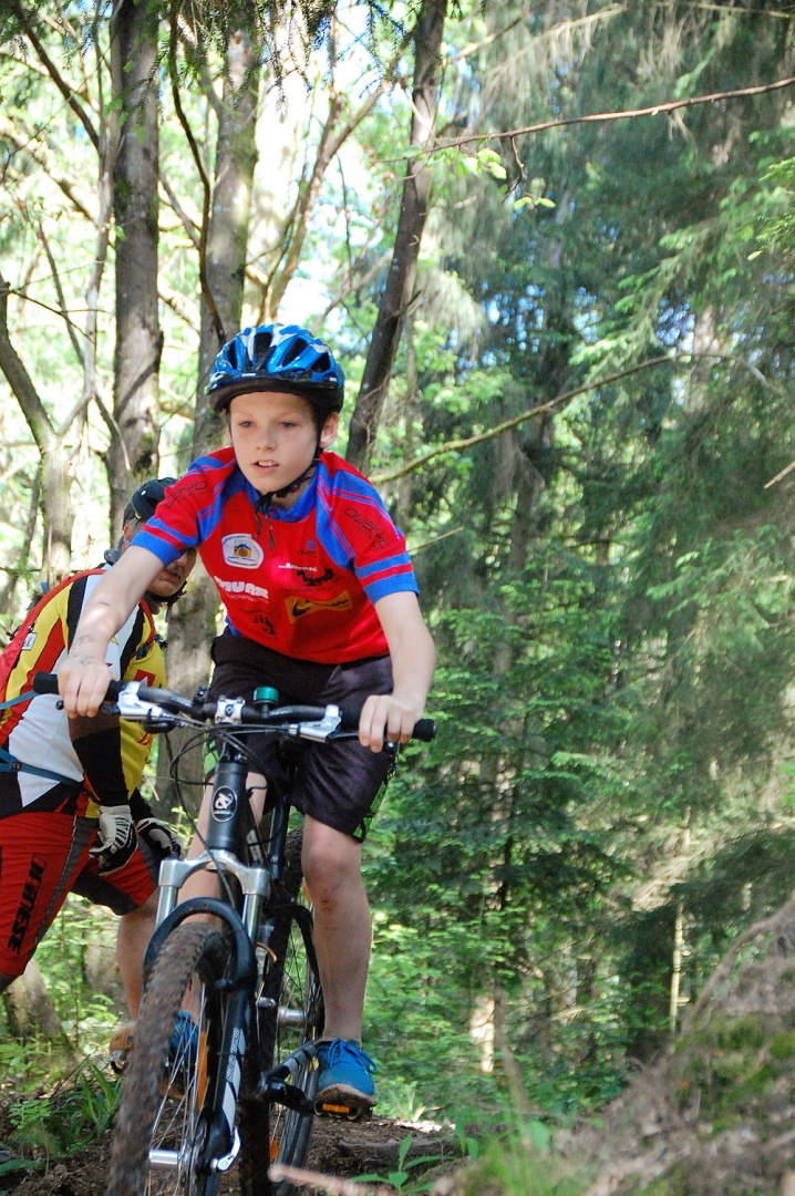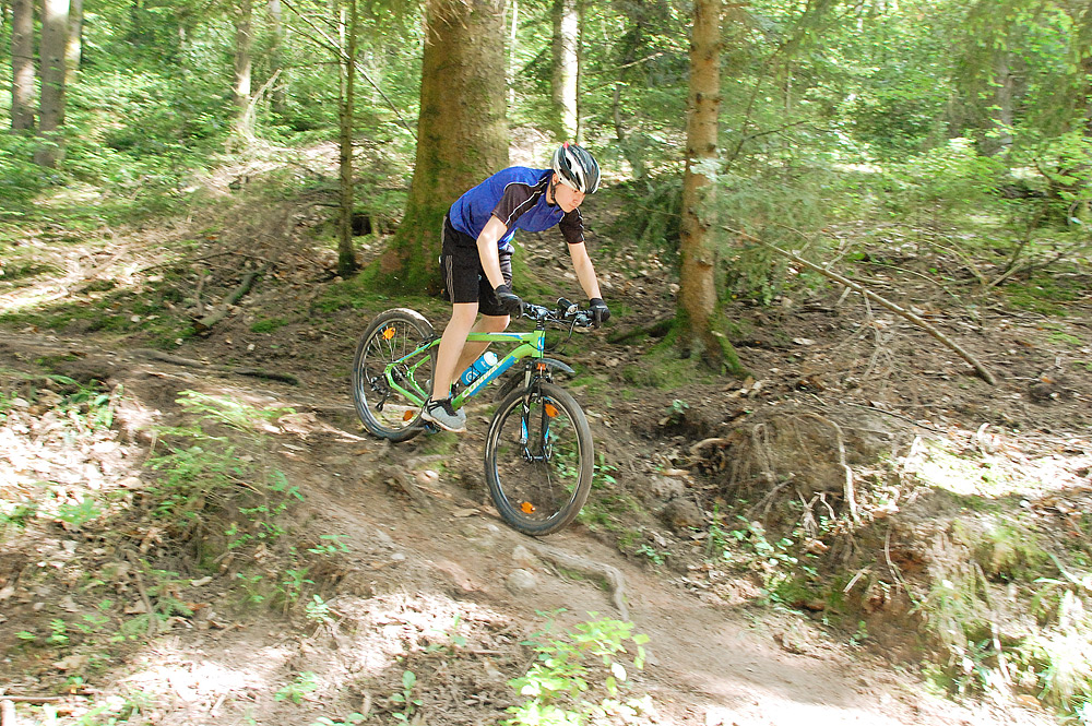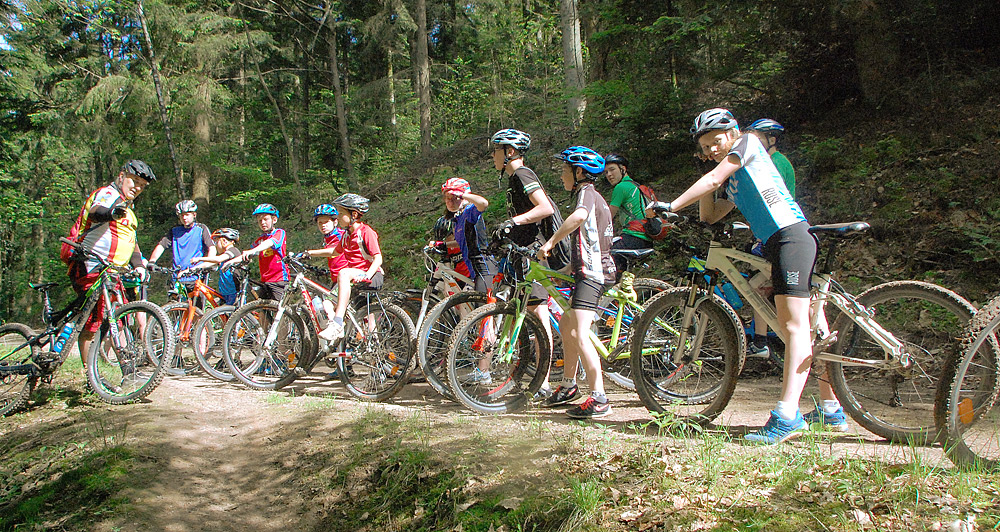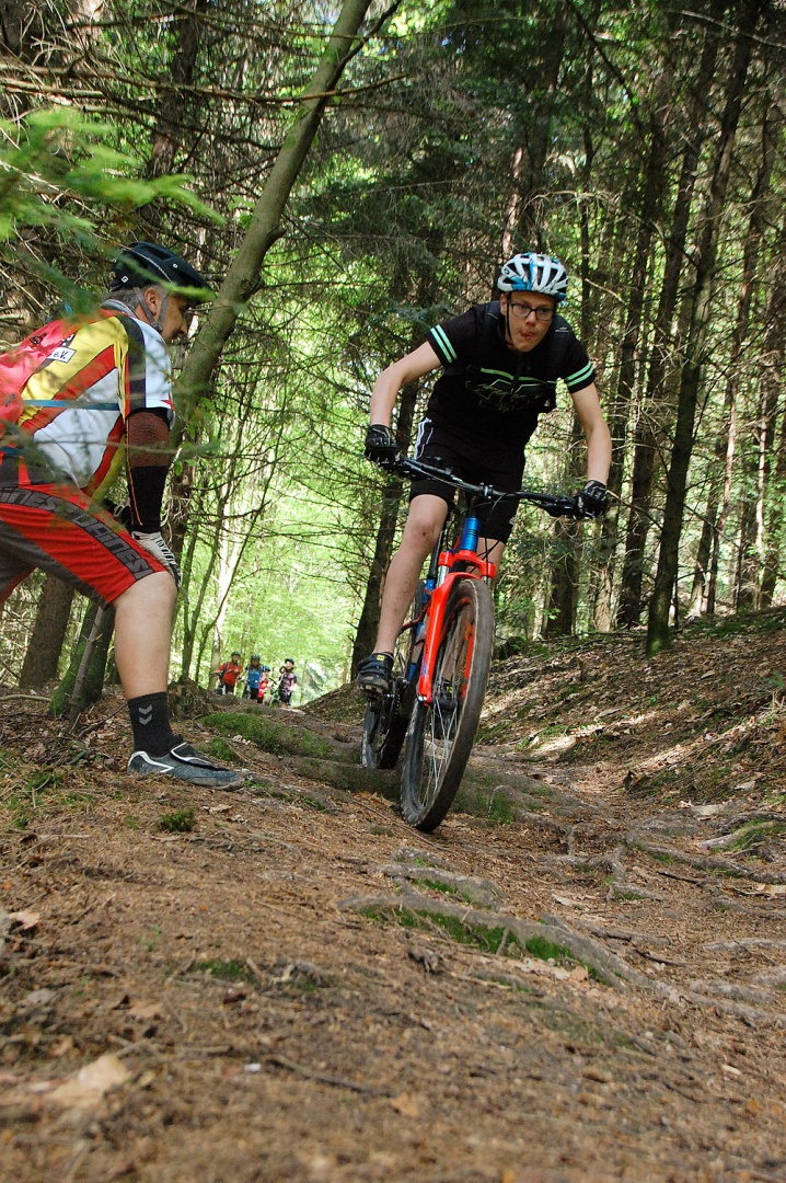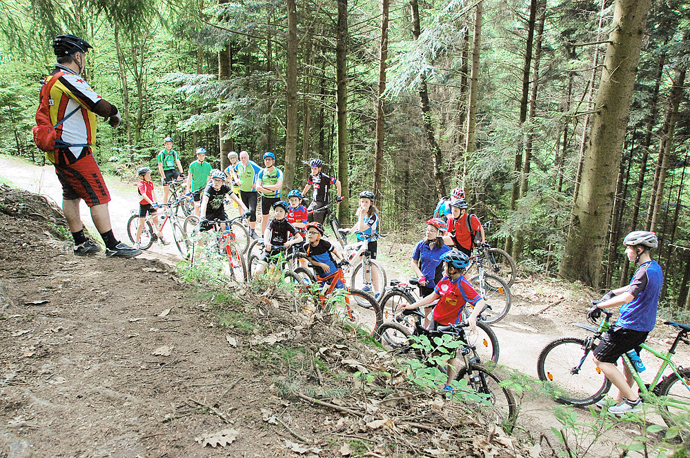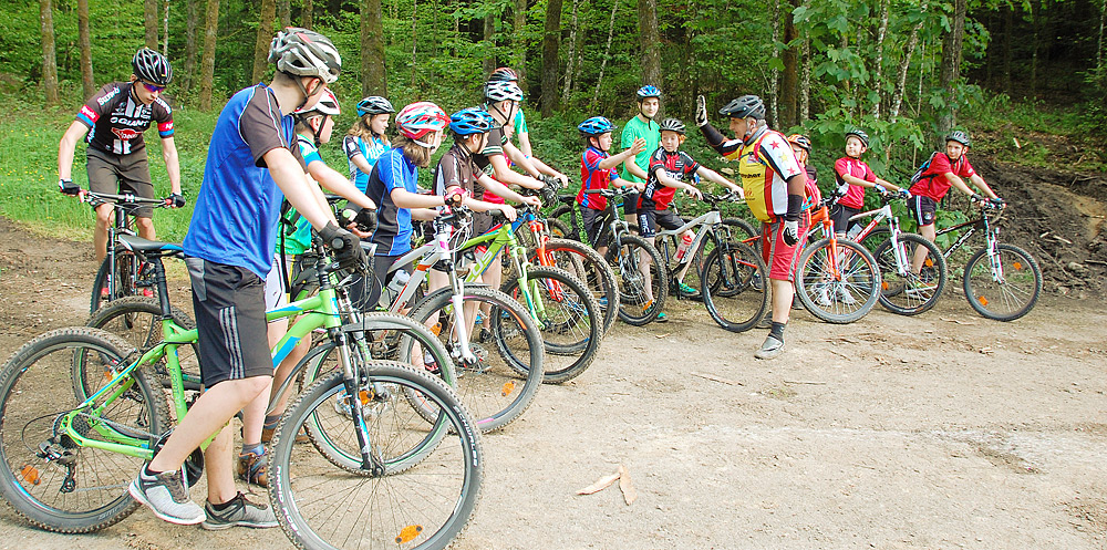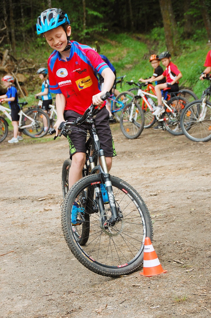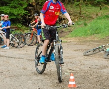 Dabei zeigte sich Christian nicht nur als exzellenter MTB- Techniktrainer, sondern fand auch bei Übungen, die bei dem einen oder andern Kind nicht optimal gelungen waren, immer aufmunterte Worte. Insgesamt zeigten die Seelbacher Bike-Kids ein erstaunlich hohes fahrtechnisches Niveau. Christian Wussler teilte sein fast dreistündiges Techniktraining mit den 13 Kindern in drei Abschnitte. So lernten die Kinder nach Übungen zur besseren Radbeherrschung auch Fahrtechniken wie enge Kurven oder steiles Berganfahren sowie man in einen Singletrail eine optimale und damit sichere Linie fährt.