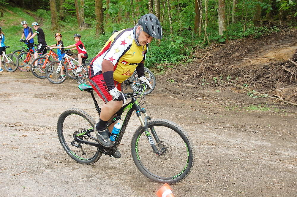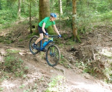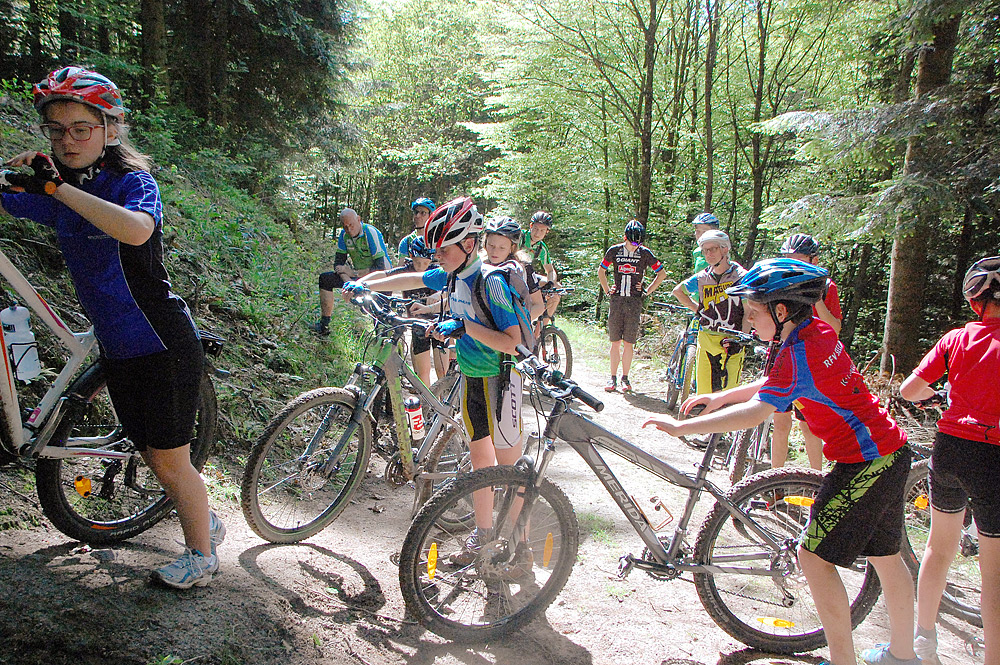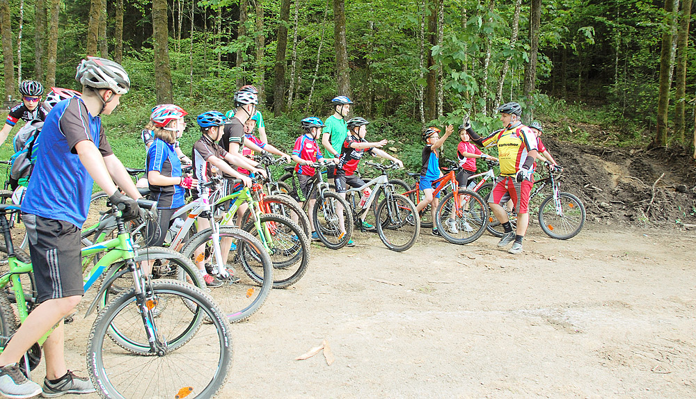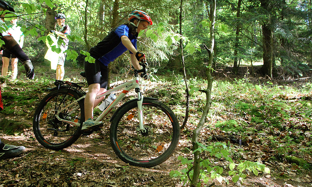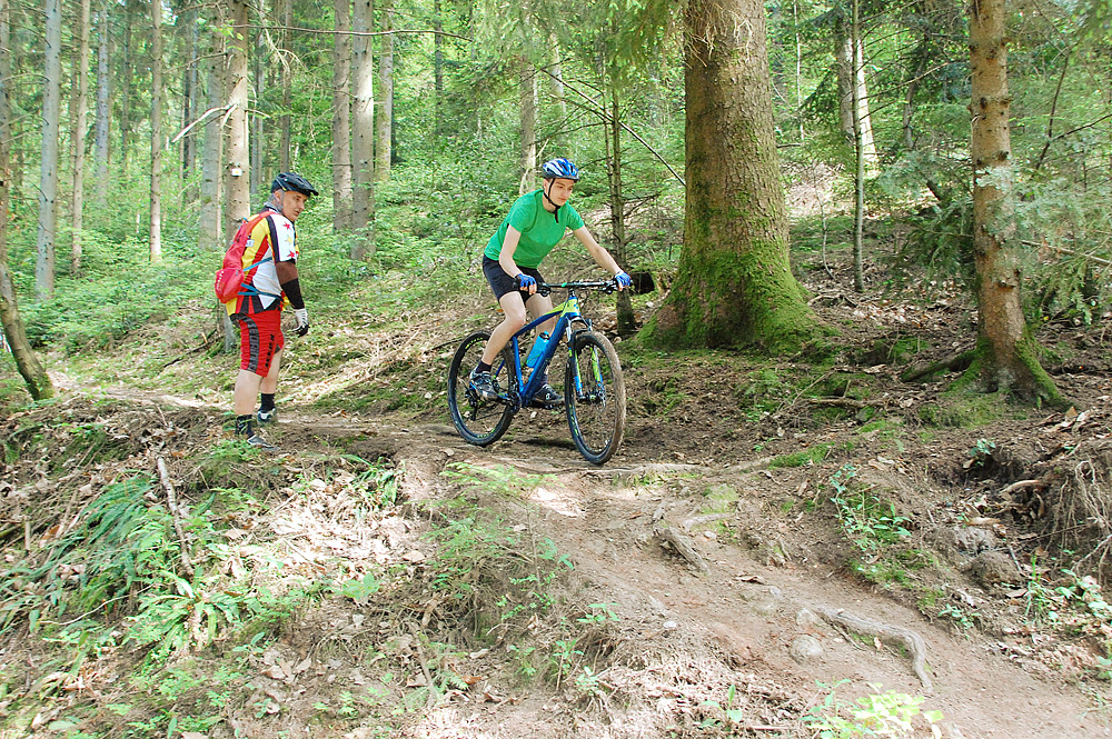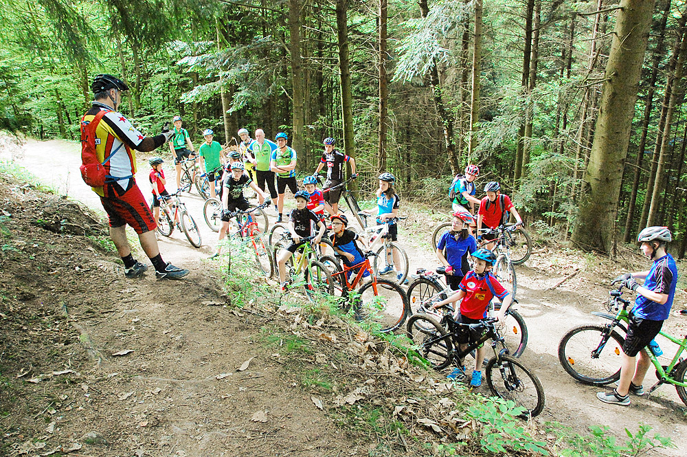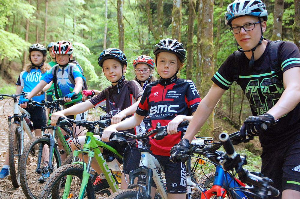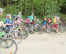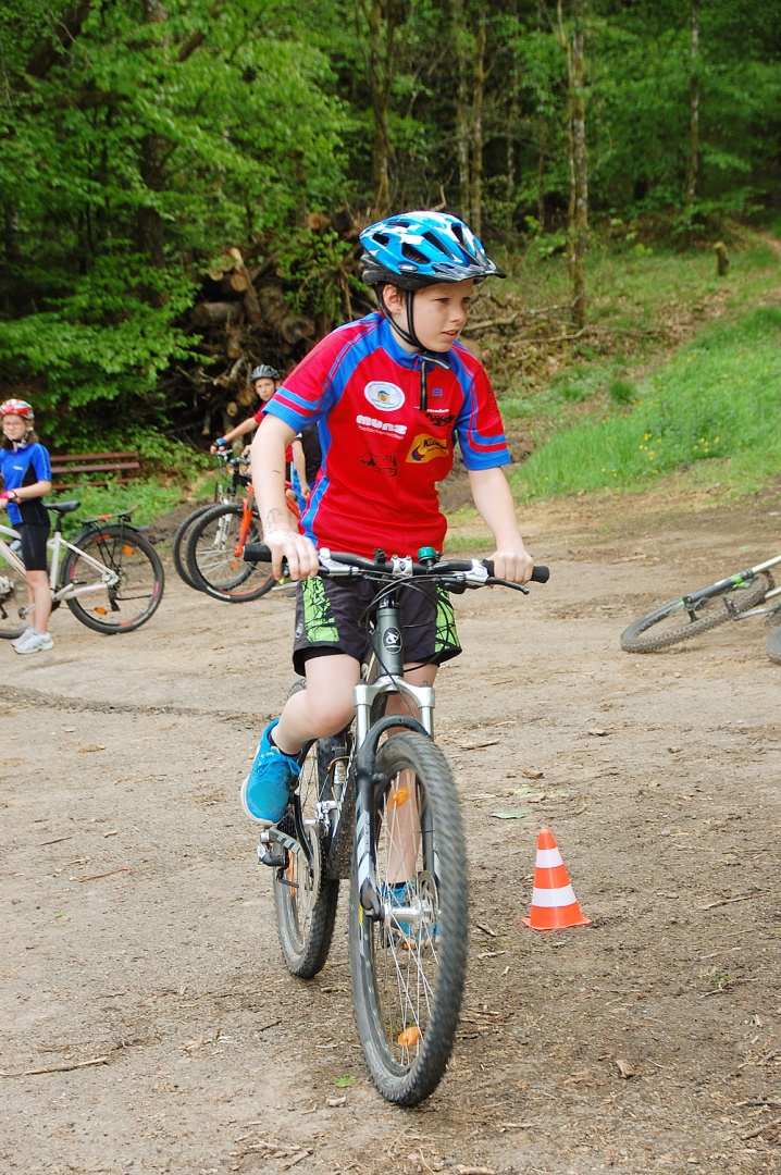 Dabei zeigte sich Christian nicht nur als exzellenter MTB- Techniktrainer, sondern fand auch bei Übungen, die bei dem einen oder andern Kind nicht optimal gelungen waren, immer aufmunterte Worte. Insgesamt zeigten die Seelbacher Bike-Kids ein erstaunlich hohes fahrtechnisches Niveau. Christian Wussler teilte sein fast dreistündiges Techniktraining mit den 13 Kindern in drei Abschnitte. So lernten die Kinder nach Übungen zur besseren Radbeherrschung auch Fahrtechniken wie enge Kurven oder steiles Berganfahren sowie man in einen Singletrail eine optimale und damit sichere Linie fährt.