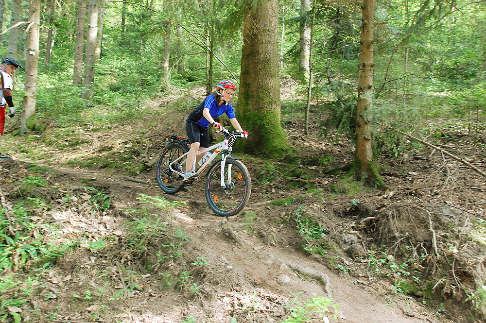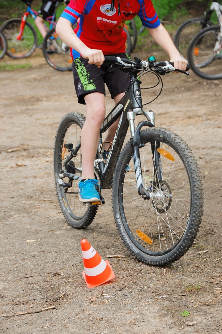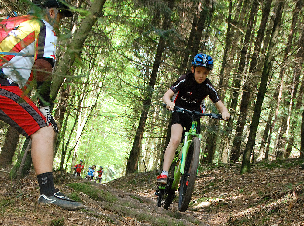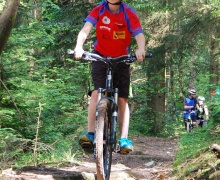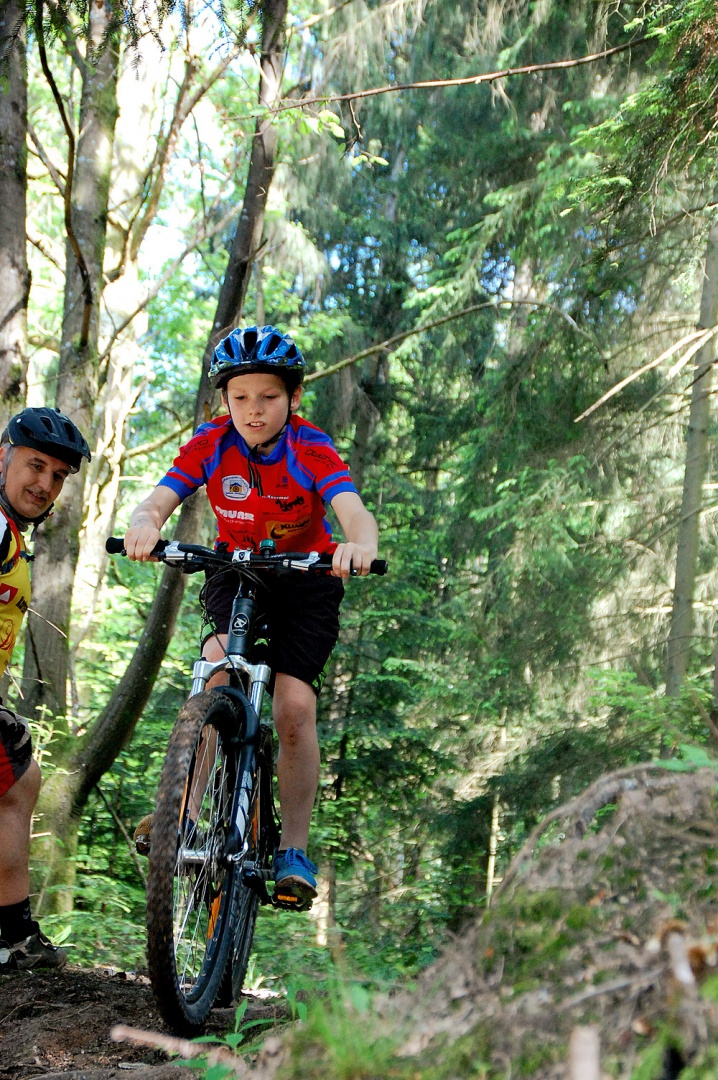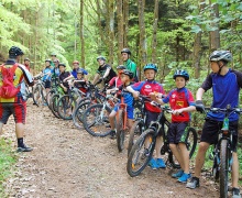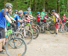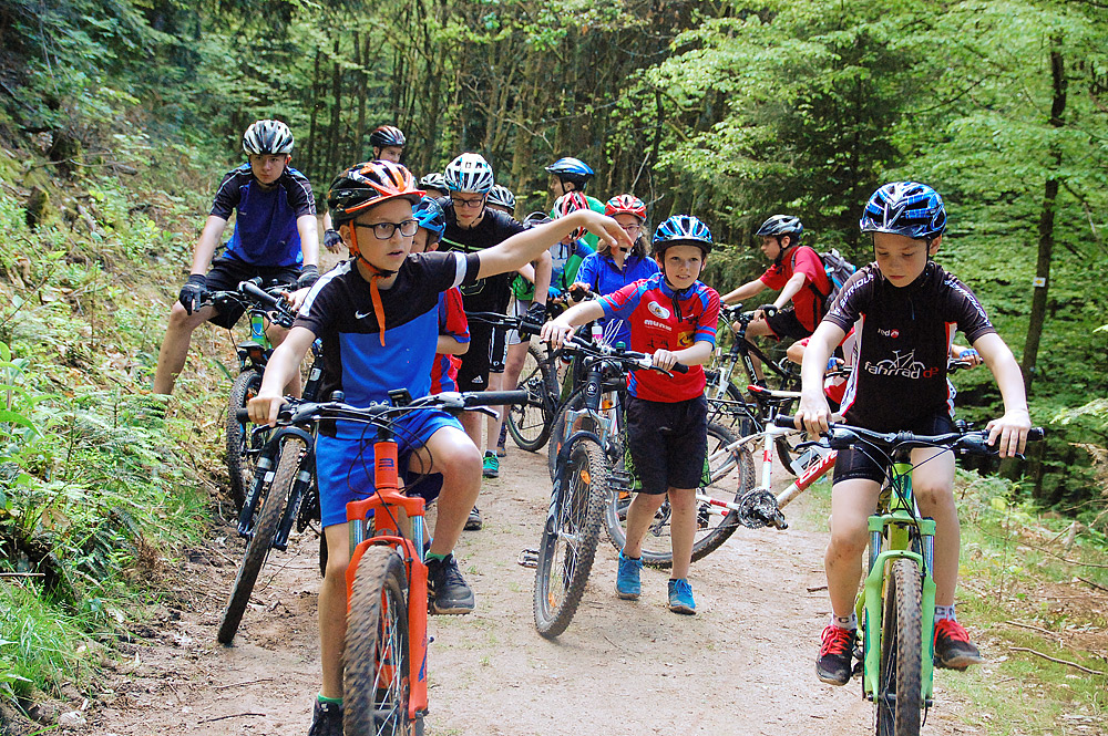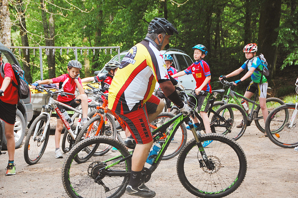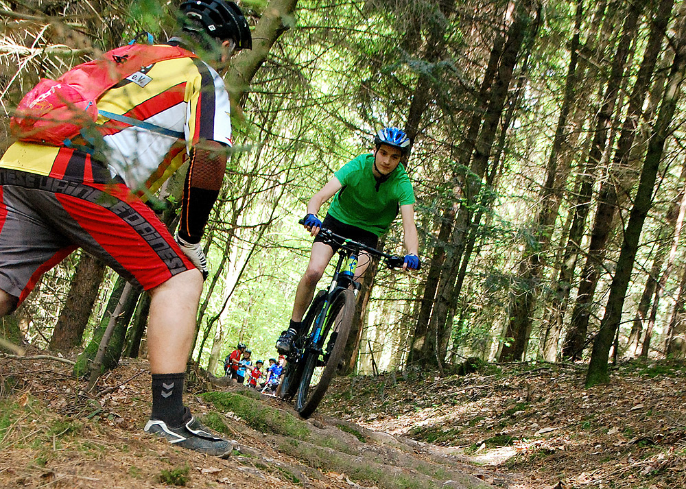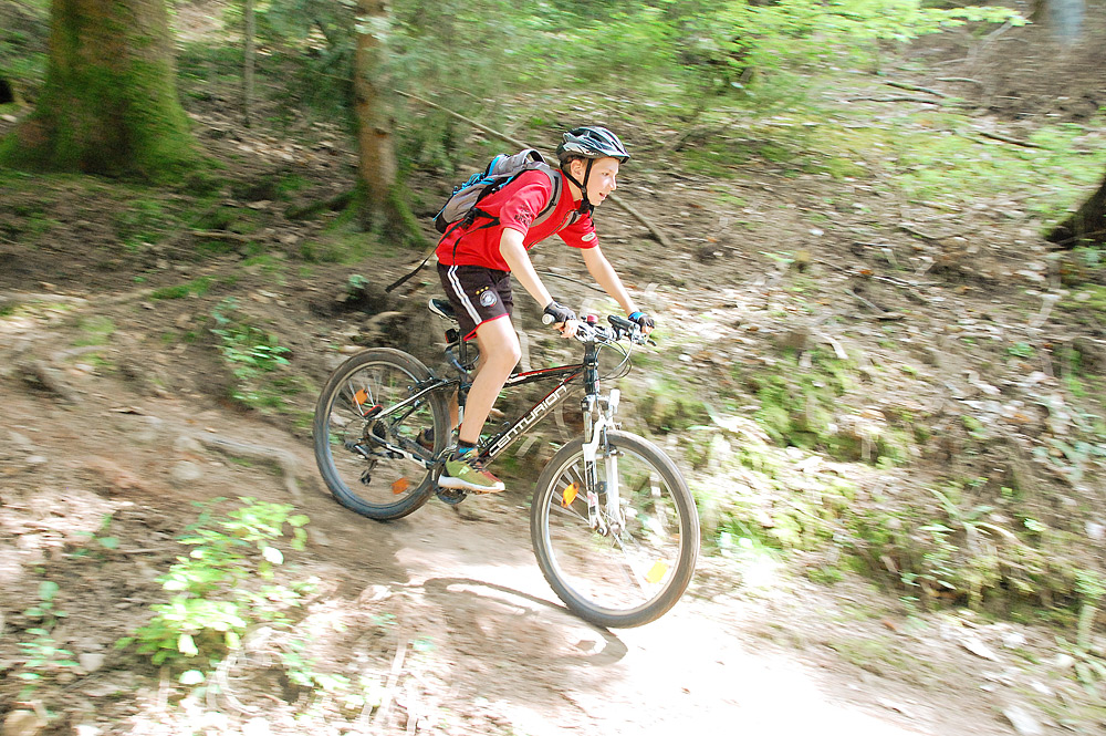 Dabei zeigte sich Christian nicht nur als exzellenter MTB- Techniktrainer, sondern fand auch bei Übungen, die bei dem einen oder andern Kind nicht optimal gelungen waren, immer aufmunterte Worte. Insgesamt zeigten die Seelbacher Bike-Kids ein erstaunlich hohes fahrtechnisches Niveau. Christian Wussler teilte sein fast dreistündiges Techniktraining mit den 13 Kindern in drei Abschnitte. So lernten die Kinder nach Übungen zur besseren Radbeherrschung auch Fahrtechniken wie enge Kurven oder steiles Berganfahren sowie man in einen Singletrail eine optimale und damit sichere Linie fährt.